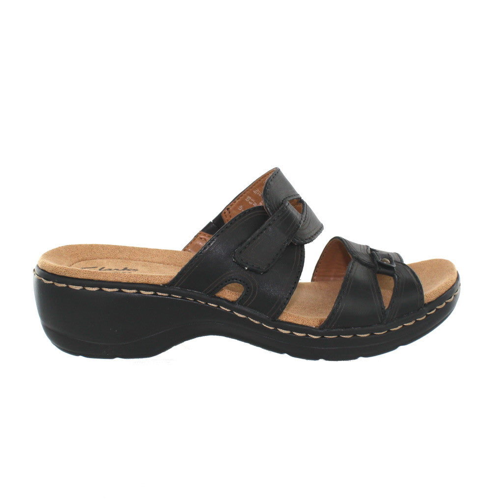 Black leather wedge mule by Clarks. Odette Basil has a cushioned leather insole and a simply styled touch close tab, which is cleverly worked into the overlay pattern to the front, also features contrastong stitch detail.
