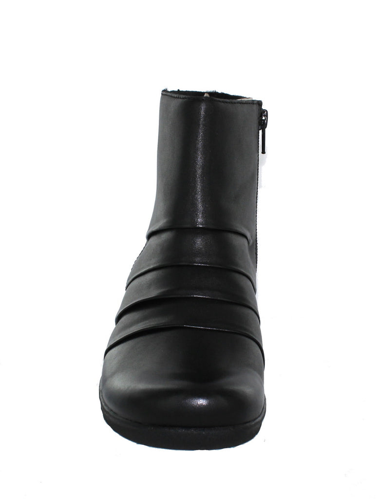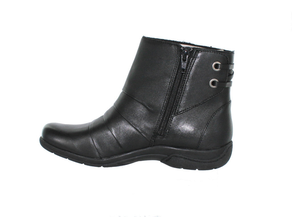 Mells Ruth in black leather is a classic boot by Clarks, one that has been around for a few winters with slight differences and a new name. Featuring a neat creased front and criss cross laced back this zip close ankle boot is a favourite for all ages.