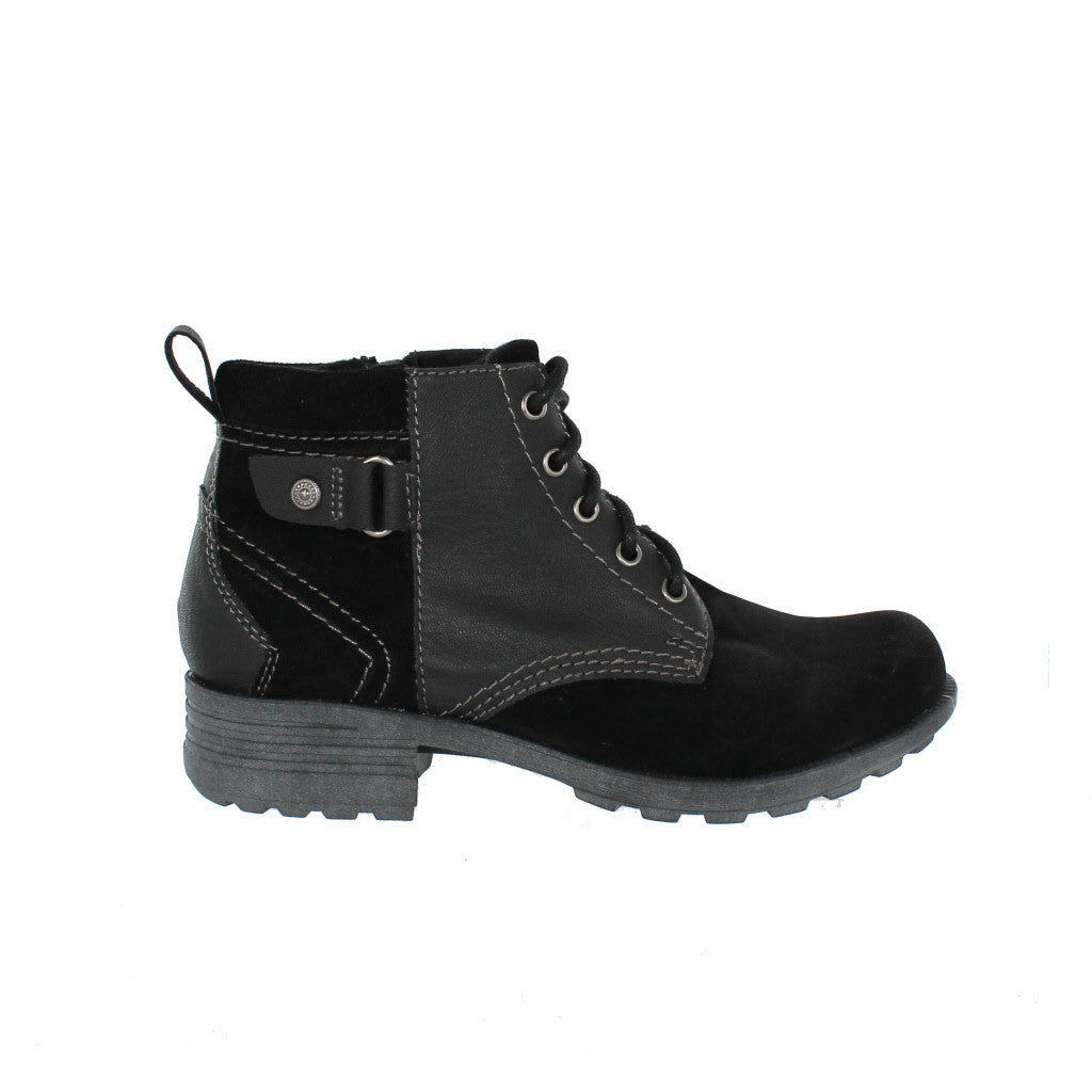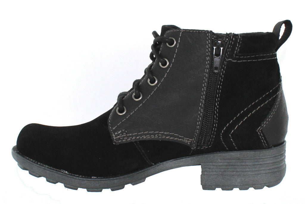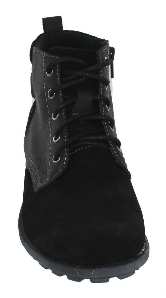 This cute little lace fronted boot has a work boot edge to it which sets it just the right side of funky and on trend. It has side zip access and is a mixture of black leather and man-made materials in patches featuring contrasting coloured stitch detail and a riveted tab. A versatile boot ready to slip into a wardrobe of virtually any age!