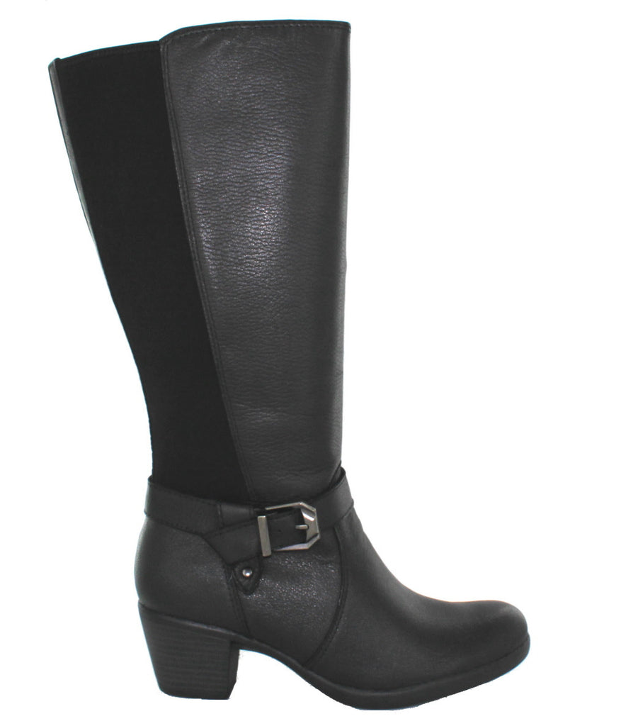 Smart looking ladies knee high boot with a 2inch heel and contoured comfort footbed. Earth Sprpt Tulsa, a super soft black leather boot featuring a buckled strap around the ankle giving just enough detail and decoration. There are also 2 full length stretch fabric panels around the back for extra calf width when needed. Also available in almond brown.