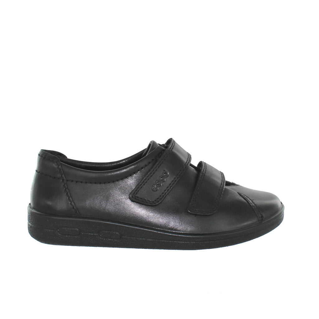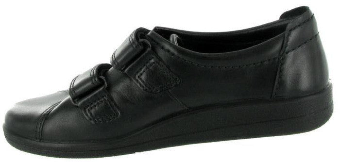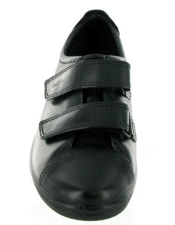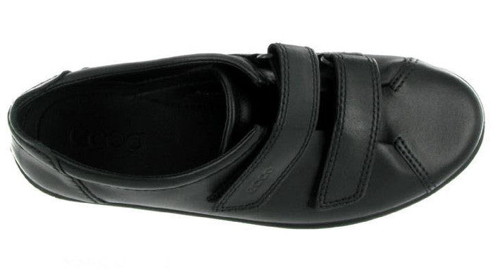 Black leather shoe with two velcro fastened straps and a removable leather insole. This comfortable style has a moisture absorbent lining that allows air to circulate and keep your feet dry and cool.