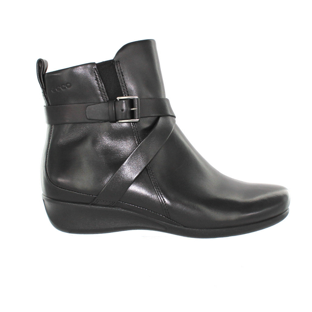 This smooth black leather ankle boot from Ecco is smart, stylish and sophisticated, it has a low wedge heel at just over 3cm and a cross over buckled strap around. Inside leg zip access and removeable cushioned footbed makes this boot comfortable enough to wear all day.
