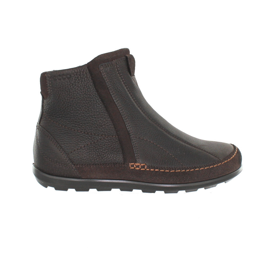 A comfortable and casual Ecco ankle boot in waxy brown feature leather with contrasting coloured stitching and a suede strip around the base giving a moccasin feel to it. A cute and comfortable boot with inside leg zip fastening and a cushioned footbed.