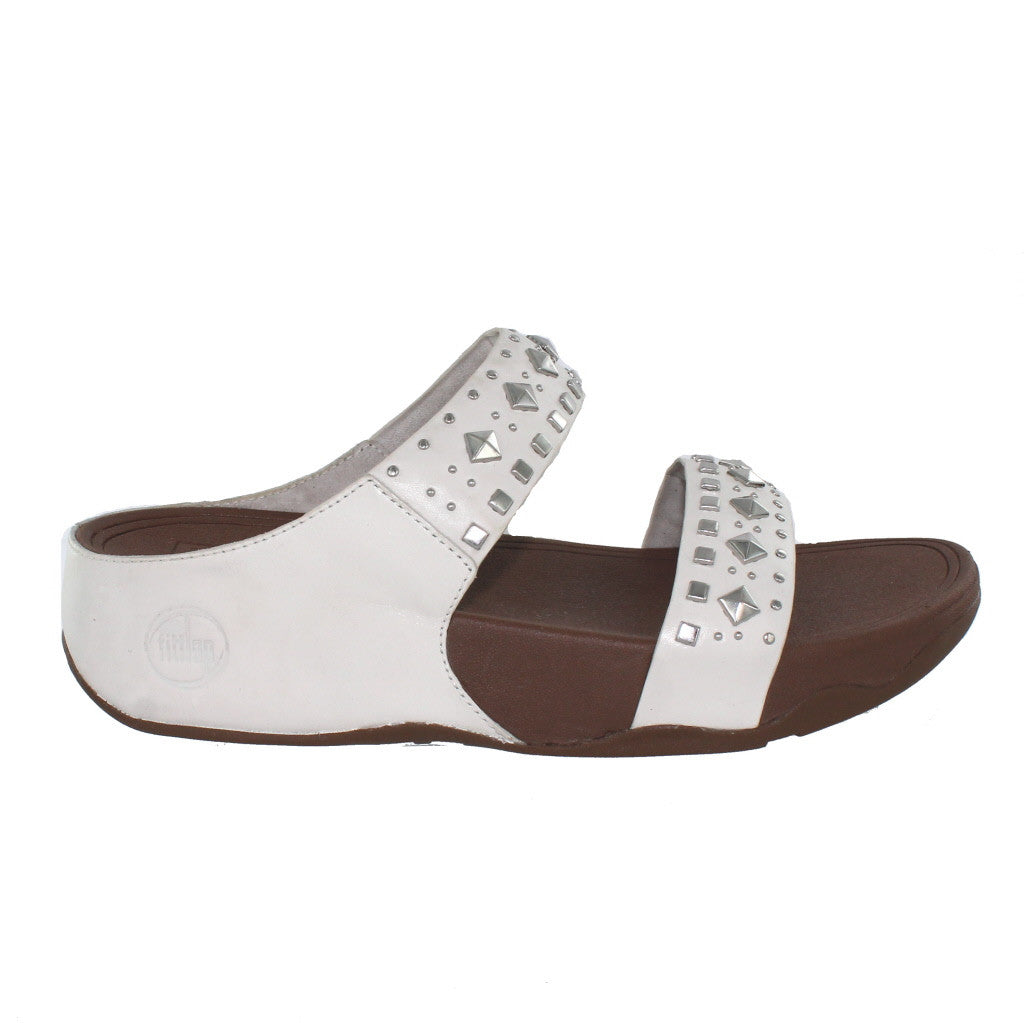 FitFlop™ Biker Chic Slide, a twin bar mule sandal in soft urban white leather with a luxurious cusioned inner lining, this season party alternative sandal has a nayural beige coloured sole and a silver studded design over the front. Also available in all black.