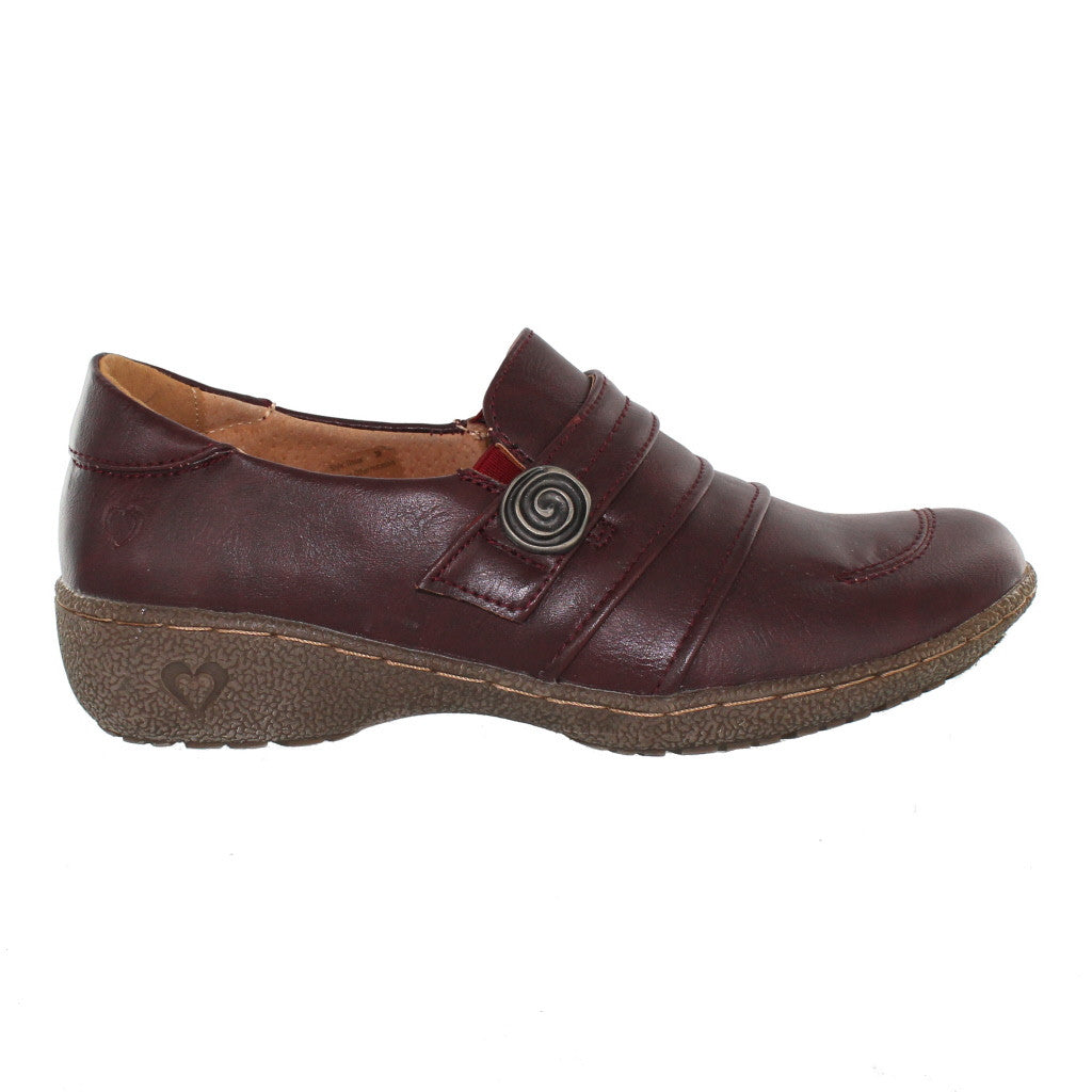 Hosta in wine is a casual full shoe by Heavenly Feet. It features a detailed bar over with a small rose like button and creased rouche to the front with detail stitching around the toe. This shoe is fully leather lined with a cushioned leather insole. Also available in black.