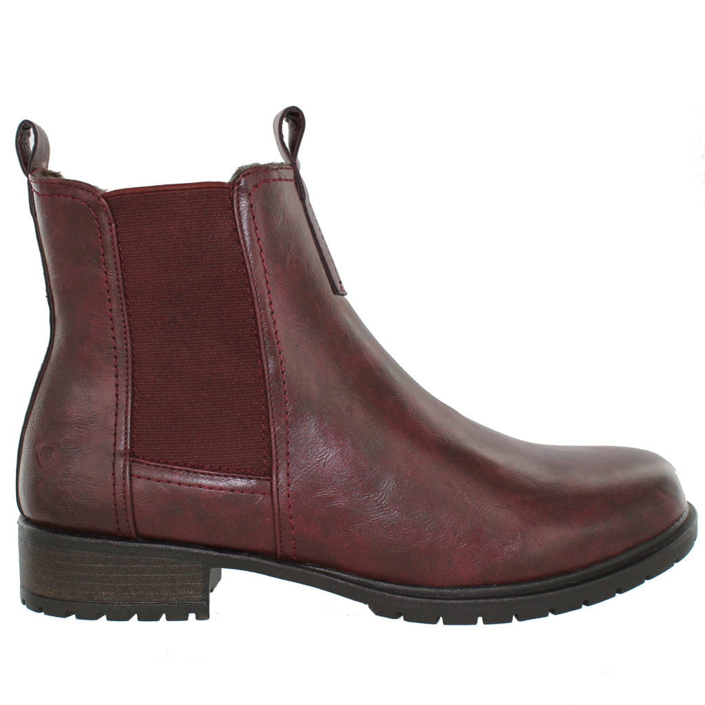 Heavenly Feet Maple, a classic Chelsea styled boot with the obvious elasticated ankle panel, pull on heel tab and simply structured sole and heel unit. This zip fastening, deep red leather look ankle boot also features a warm lining and leather insole