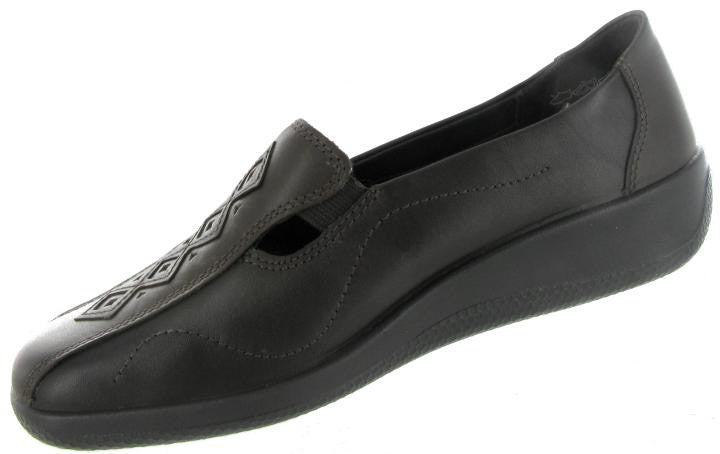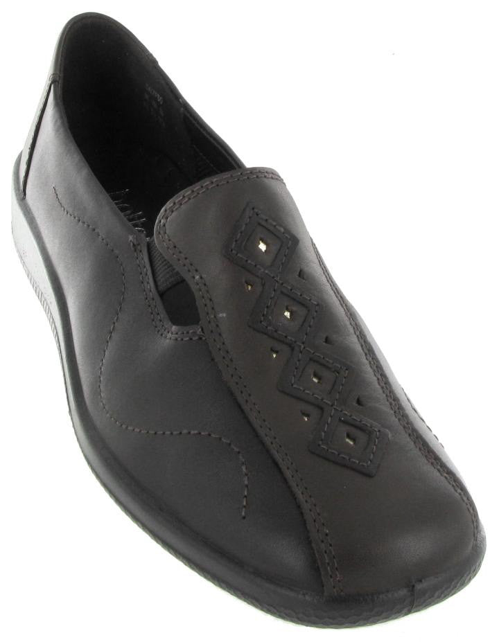 Hotter Calypso in chocolate brown is a classic slip-on with attractive applique detailing, it is blissfully light and feminine, perfect with skirts and fine knits. The twin flexing inserts give with each step on our famously soft flexing sole. Removable insoles and approximate 1 inch heel. Also available in soft black leather.