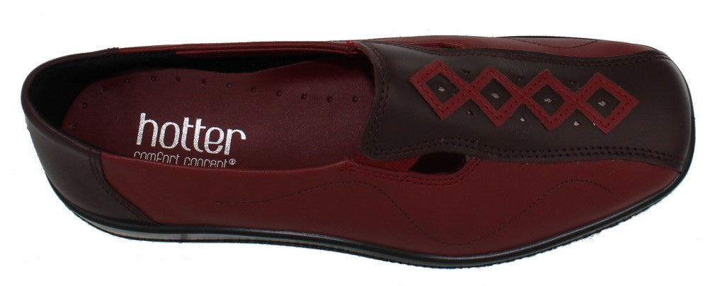 Ruby red and cherryberry leather combination Hotter Calypso is an exciting new colour for this season, this favourite slip-on features attractive applique detailing and is blissfully light and feminine, perfect with skirts or trousers. The twin flexing inserts give with each step on Hotters famously soft flexing sole. Removable insoles and approximate 1 inch heel. Also available in soft black leather.