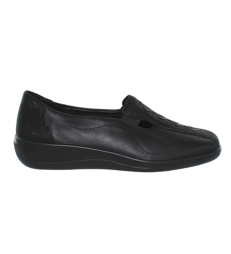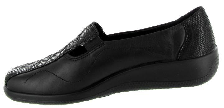Hotter Calypso ladies casual shoe, a classic slip-on with attractive applique detailing, it is blissfully light and feminine, perfect with skirts and fine knits. The twin flexing inserts give with each step on the famously soft flexing sole. Removable insoles and approximate 1 inch heel. Available in soft black or chocolate brown leather.