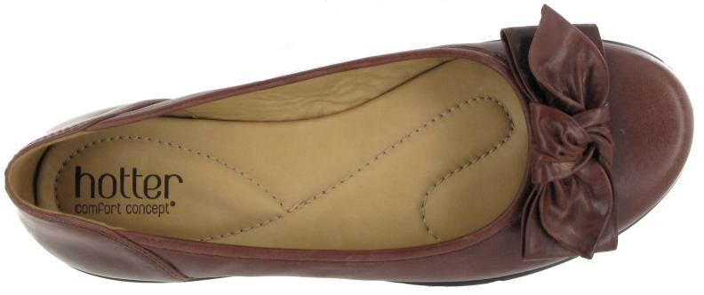 Hotter Jewel is both comfortable and stylish, in rich chestnut brown leather this is a beautiful ballerina pump, with pillow-like underfoot cushioning and an on trend knotted bow to the front. The slightly raised heel wedge in no higher than 25mm but gives the lift required for the look. Also available in either classic black or vibrant red.