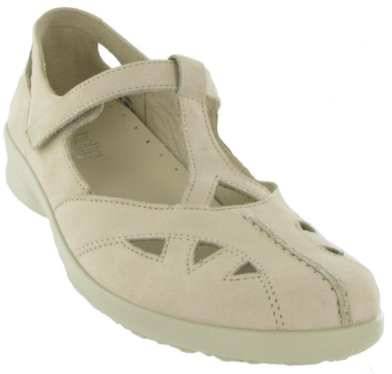 Hotter Nutmeg in soft beige, a lightweight summer shoe with pretty cut out detailing, perfect for evening strolls. The t-bar straps and stitch detail adds to the appeal of this lovely casual shoe, meaning you wont want to take them off! Also available in raspberry nubuck.