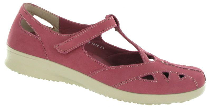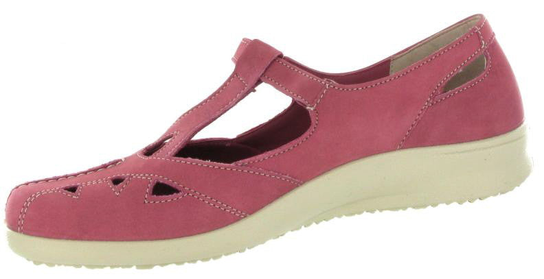 Hotter Nutmeg is a lightweight summer shoe with cut out detailing and is perfect for evening strolls. The contrasting coloured stitching adds to the appeal of this lovely raspberry coloured nubuck shoe meaning you wont want to take them off! Also available in soft beige leather.