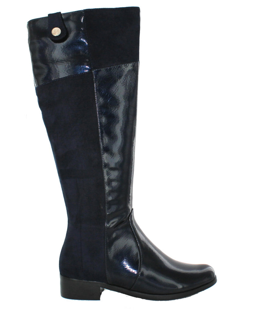 A beautiful knee high boot by Lunar in navy patent with microfibre panels. With a 1.5 inch heel and inside leg zip access this boot is both practical and comfortable and can be worn with skinny jeans or leggings or skirts and woolly knits.