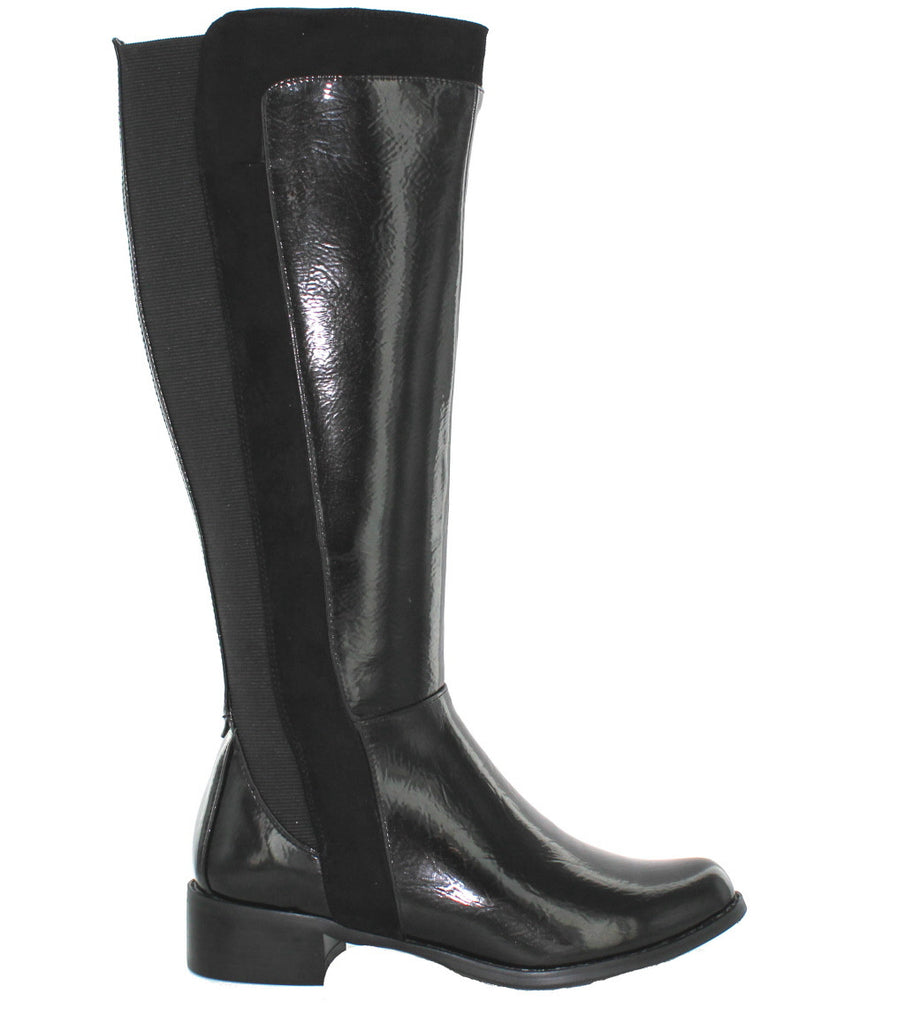 Ladies knee high boot by Lunar, GLC375 Vanessa is a simple, plain designed black patent boot with a faux suede trim on the outside of the leg and further back is an elastic panel sewn in, a classy look and being practical giving extra stretch where needed. With inside leg zip access.