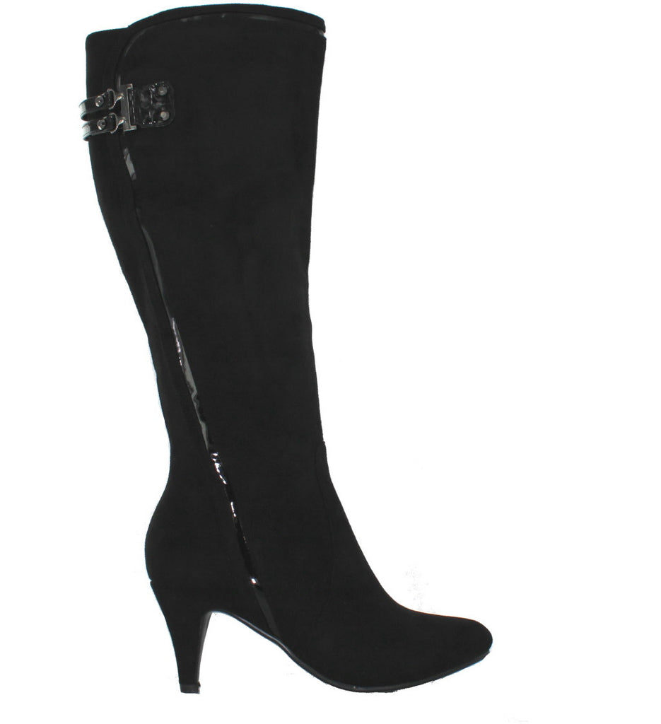 Ladies knee high black boot by Lunar, this gorgeous boot is made from super soft micro fibre, faux suede feel material. It has a narrow patent panel up the outside of the leg that carries on around the top line of the boot, with a detailed buckle decoration and inside leg zip access. This 3inch heeled boot is elegant, stylish and in stretch fit material so is sure to be a class boot.