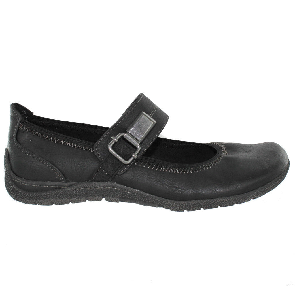 Black casual slip on shoe with a luxuriously soft footbed and elasticated top line. A fancy metal buckle effect adornment finishes the fixed strap perfectly with an elastic loop though for give when slipping on or off.