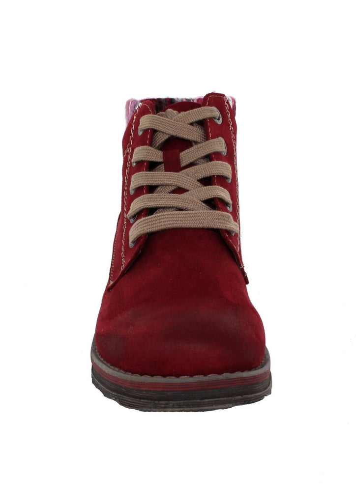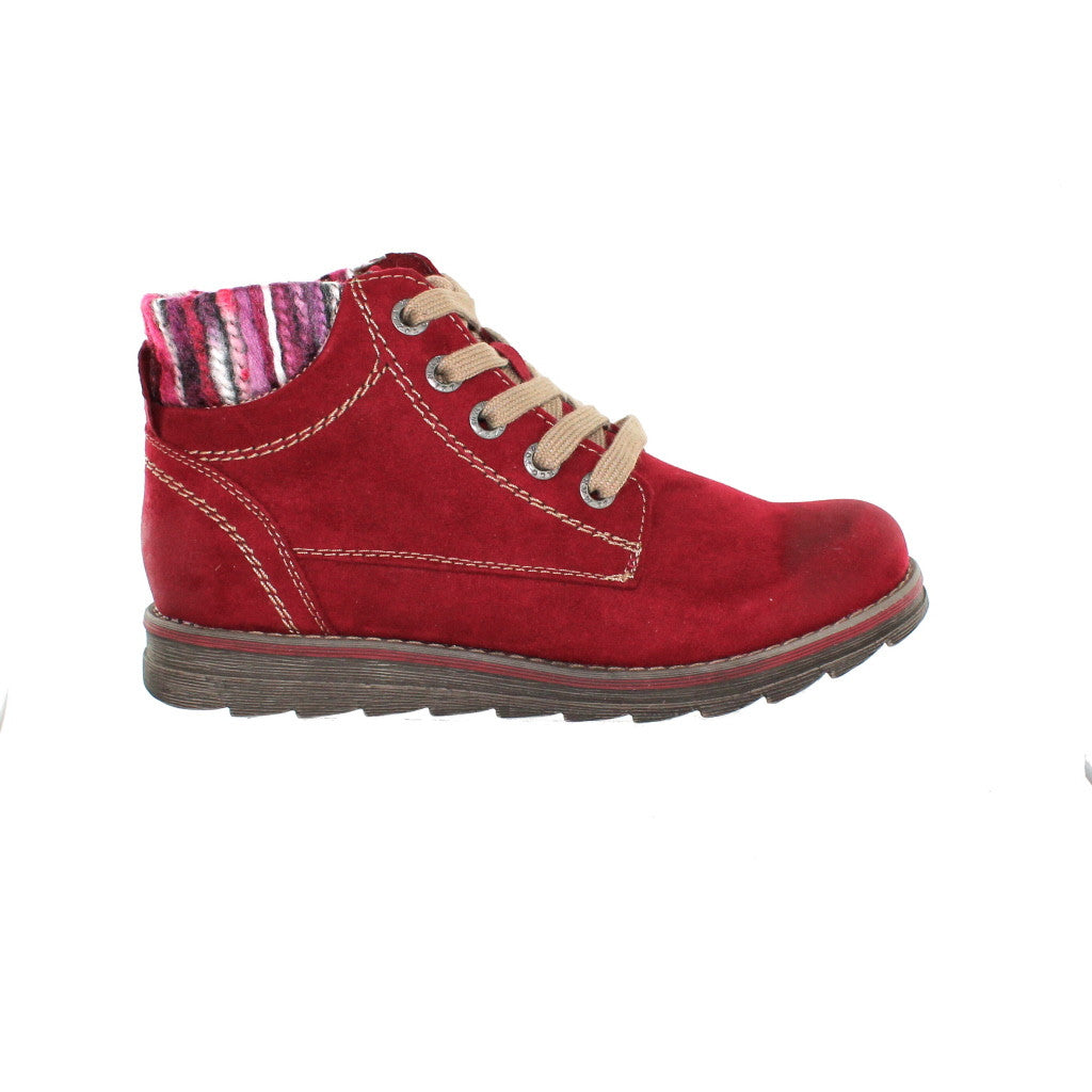 A casual lace up ankle boot by Marco Tozzi, available in either red or navy with a knitted collar cuff around the ankle. This boot is suede like microfibre material, not leather, so would need a spray of shower proof coating for protection. Featuring contrasting coloured stitching, a warm lining and side zip access this bootis an ideal accompaniment to your casual winter woollies.