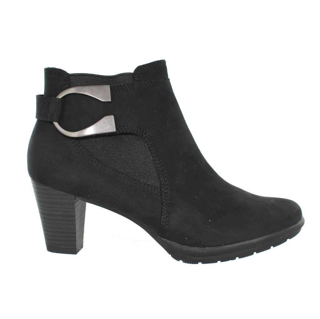 A stylish and on trend boot by Marco Tozzi, this black boot is comfortable and has a soft warm lining, the outside feels like a combination of canvas and microfibre faux suede, it is very soft. Featuring a large elastic side panel behind a decorative strap and metal loop this block heeled boot would look great with tube skirts and patterned tights or skinny jeans and chunky knits. Also available in navy.