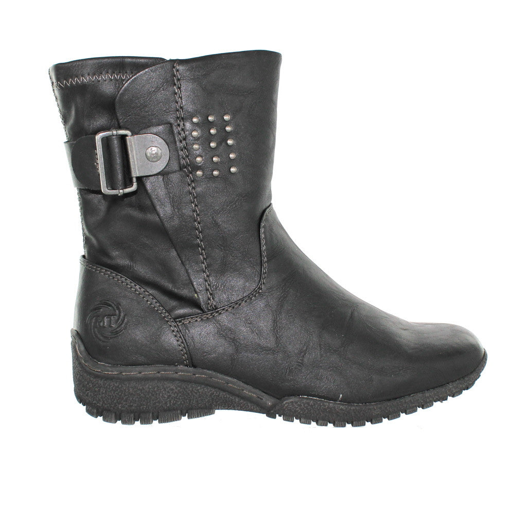 A cute little ankle boot by Marco Tozzi in feature detailed leather look material. This boot has a geometric rivet pattern, contrasting coloured stitching and a metal buckled strap. This boot is soft lined and lightly padded making it comfortable aswell as stylish.