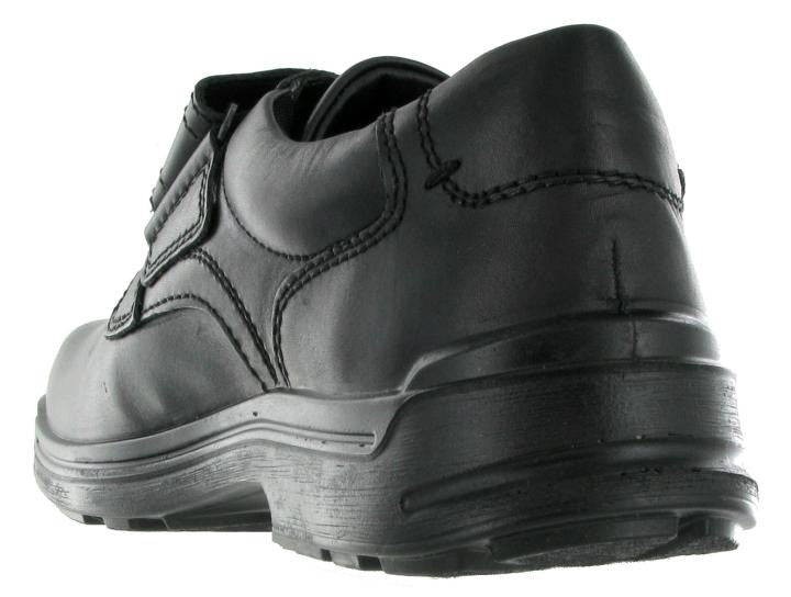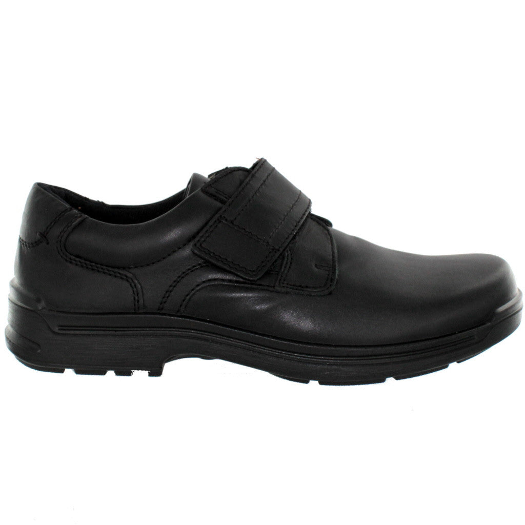 Smooth black leather shoe with a single touch close velcro strap. Hotter Sedgwick is lightweight, flexible and features a cushioning underfoot.