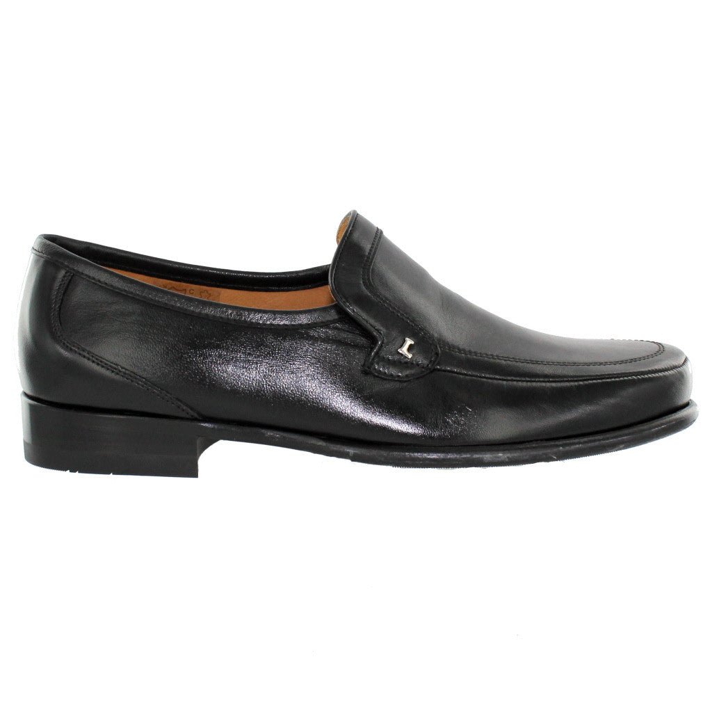 Loake Pisa, an apron fronted moccasin made from soft black nappa leather. The sole is rubber and the shoe is fully leather lined.