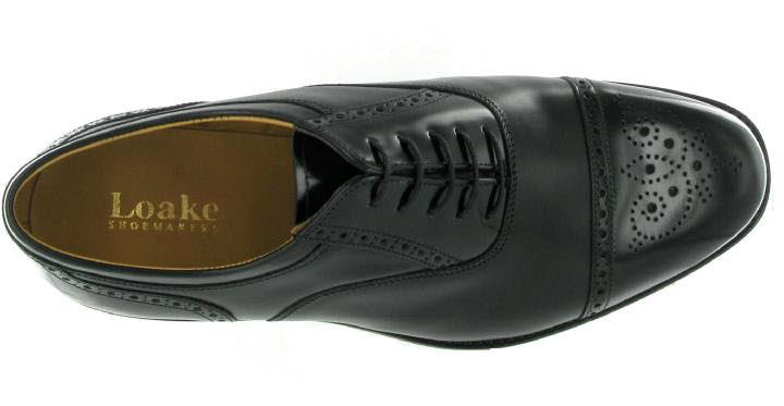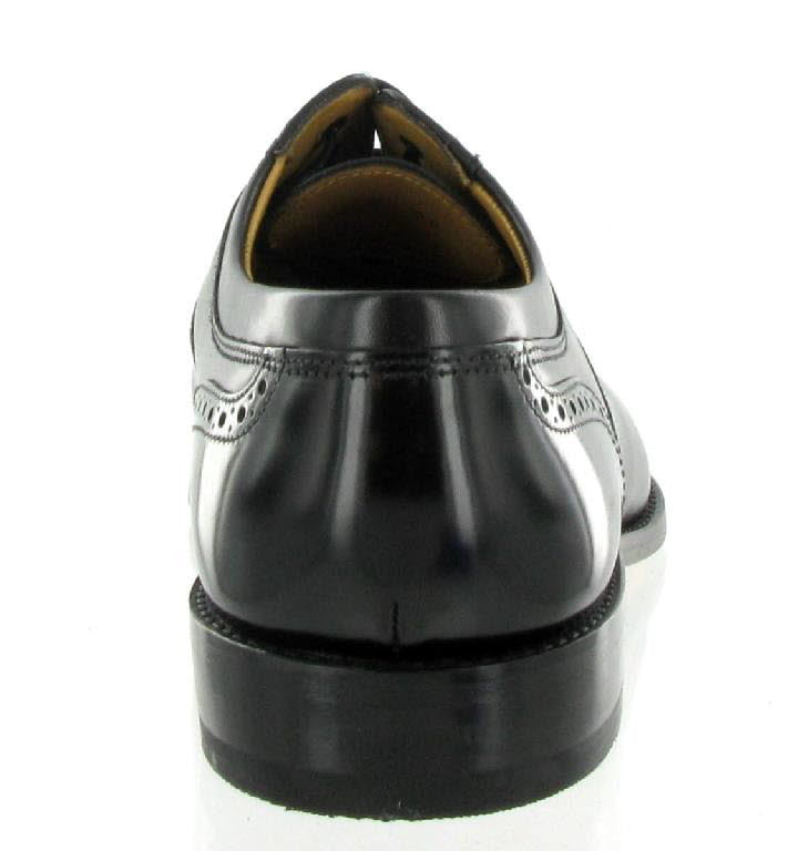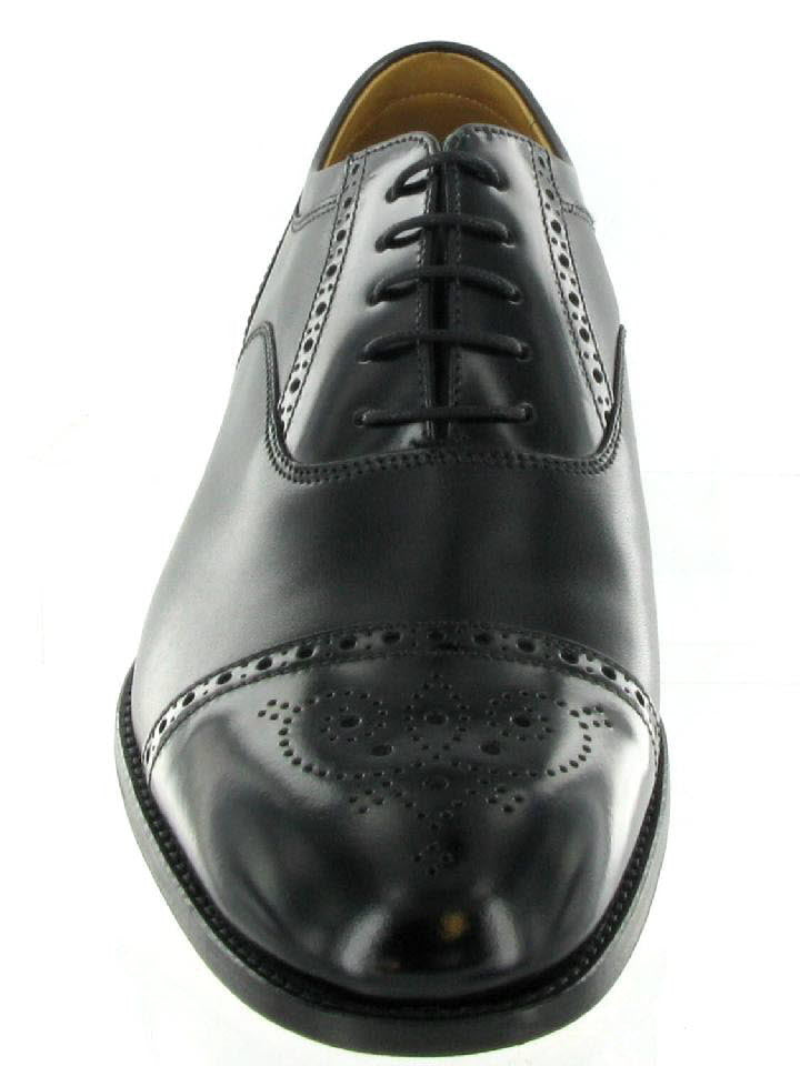 Brogue punched, two tone oxford shoe in grain calf leather with a polished leather toe cap. This popular style is fully leather lined and has cushioned leather insoles for comfort.