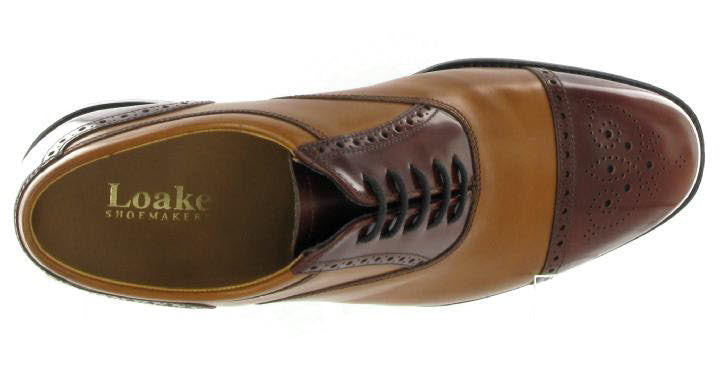 Brogue punched, two tone oxford shoe in grain calf leather with a polished leather toe cap. This popular style is fully leather lined and has cushioned leather insoles for comfort.